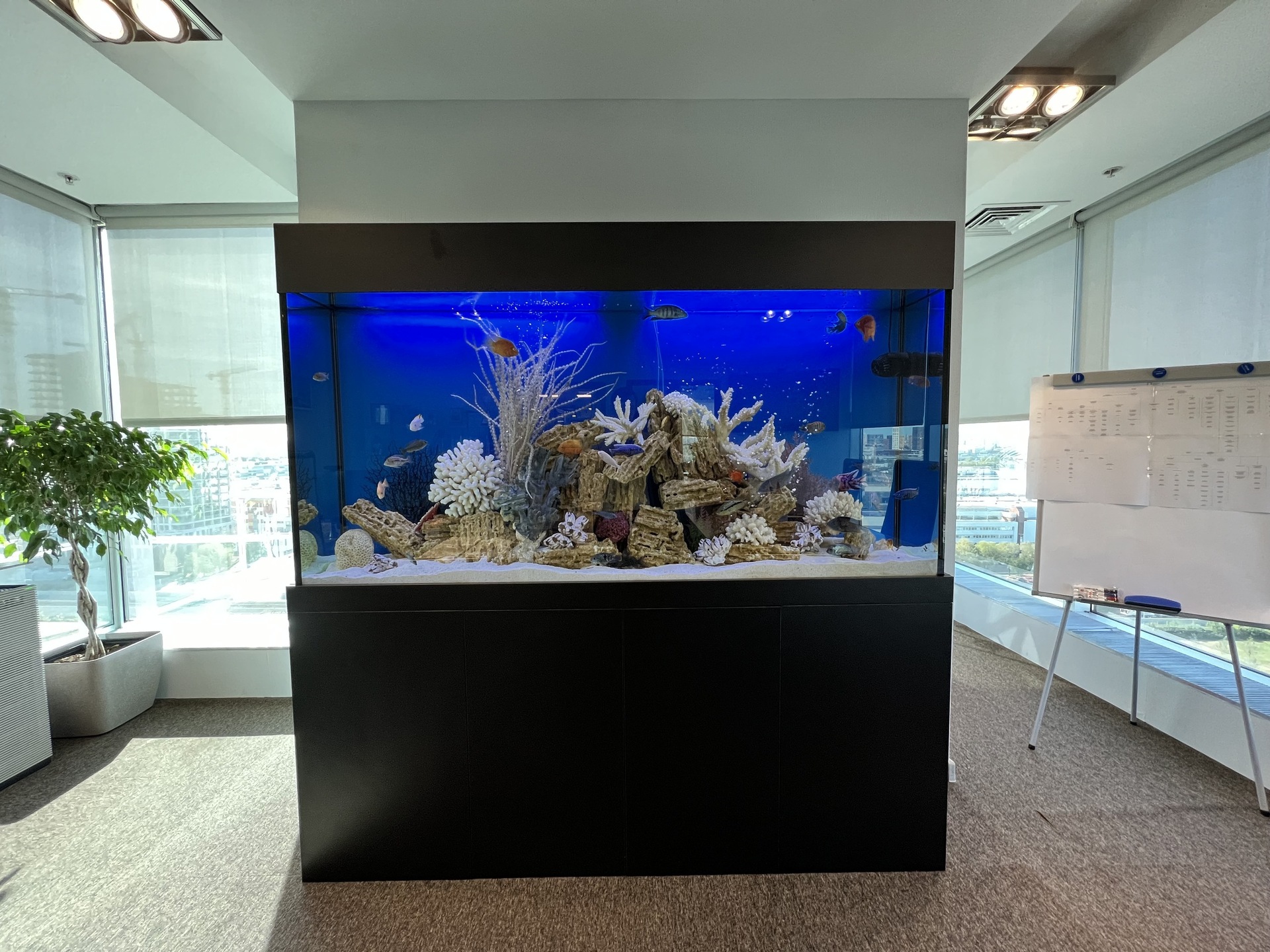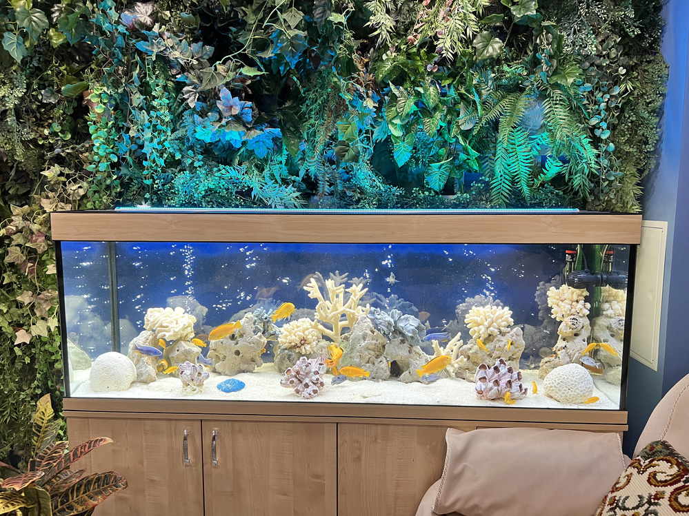 Акваскейп — это своего рода ландшафтный дизайн, созданный внутри аквариума при помощи несложных правил и наличия вкуса. Сочетания грунта, камней, коряг и растений, а также верно подобранных подводных жителей формируют картину, художником которой является оформитель аквариума. Мелкие детали завораживают, такой аквариум может надолго притянуть внимание и стать жемчужиной интерьера. Объем: 300 литров.