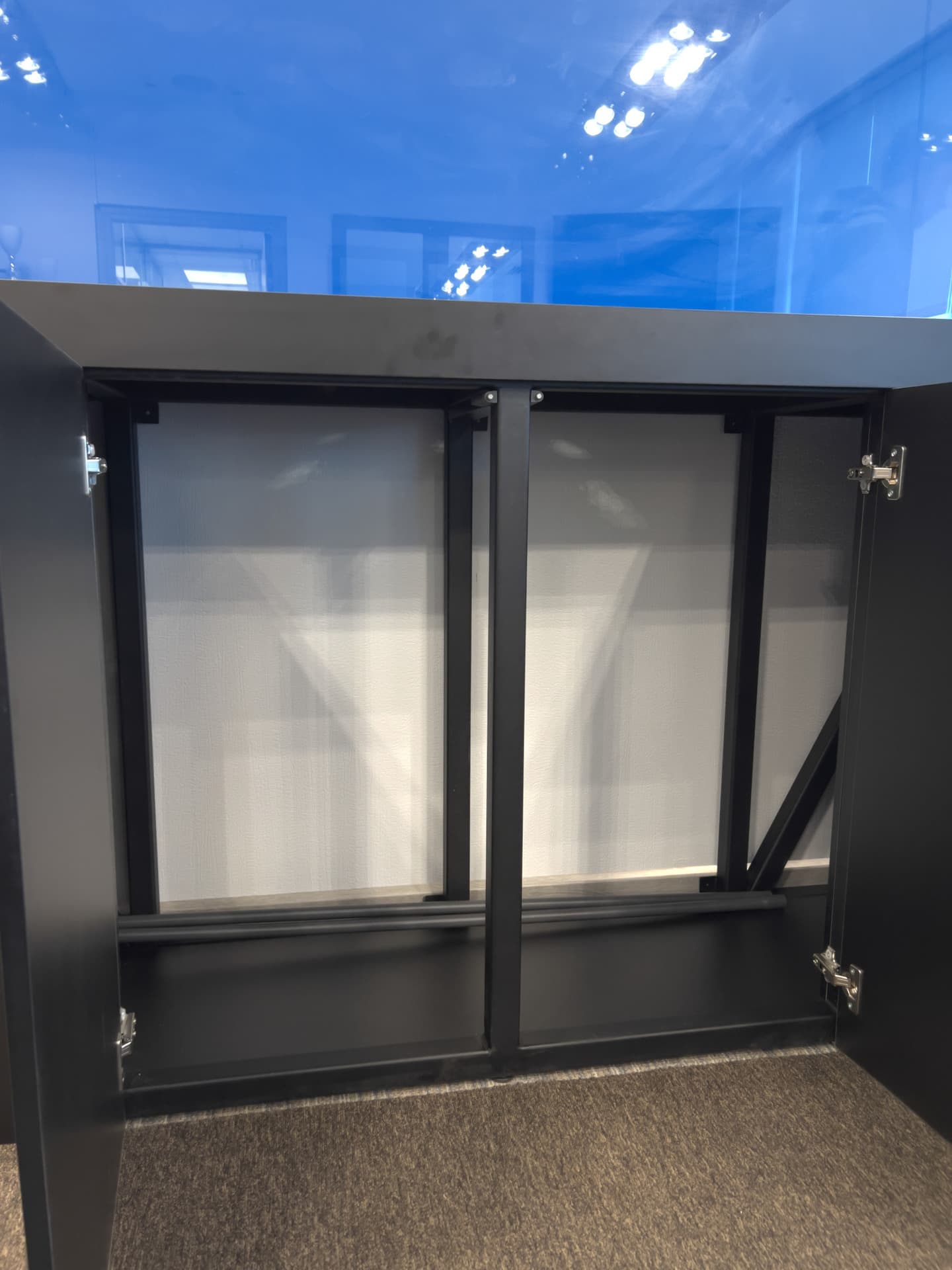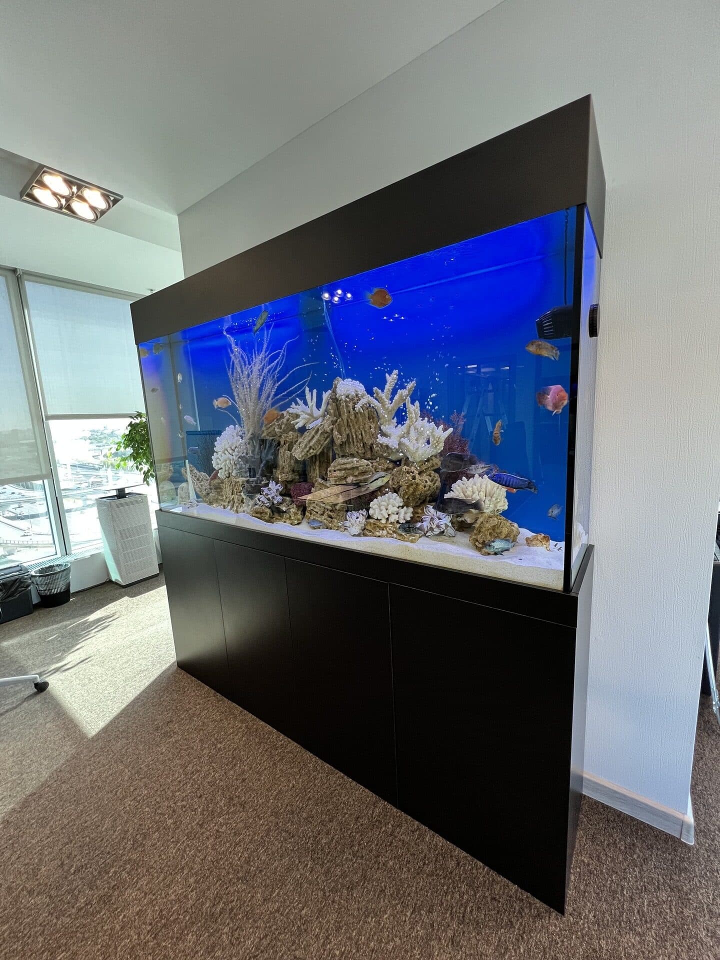 Компания переехала в новое помещение, где находился старый аквариум. Решено было сделать похожий, но больше и современнее. Заказчик остался доволен, в аквариуме обитает более 30 рыбок, выбор пал именно на цихлид, так как они постоянно на виду и своим разнообразием цветов притягивают взгляд. Хорошее решение в кабинет руководителю компании.