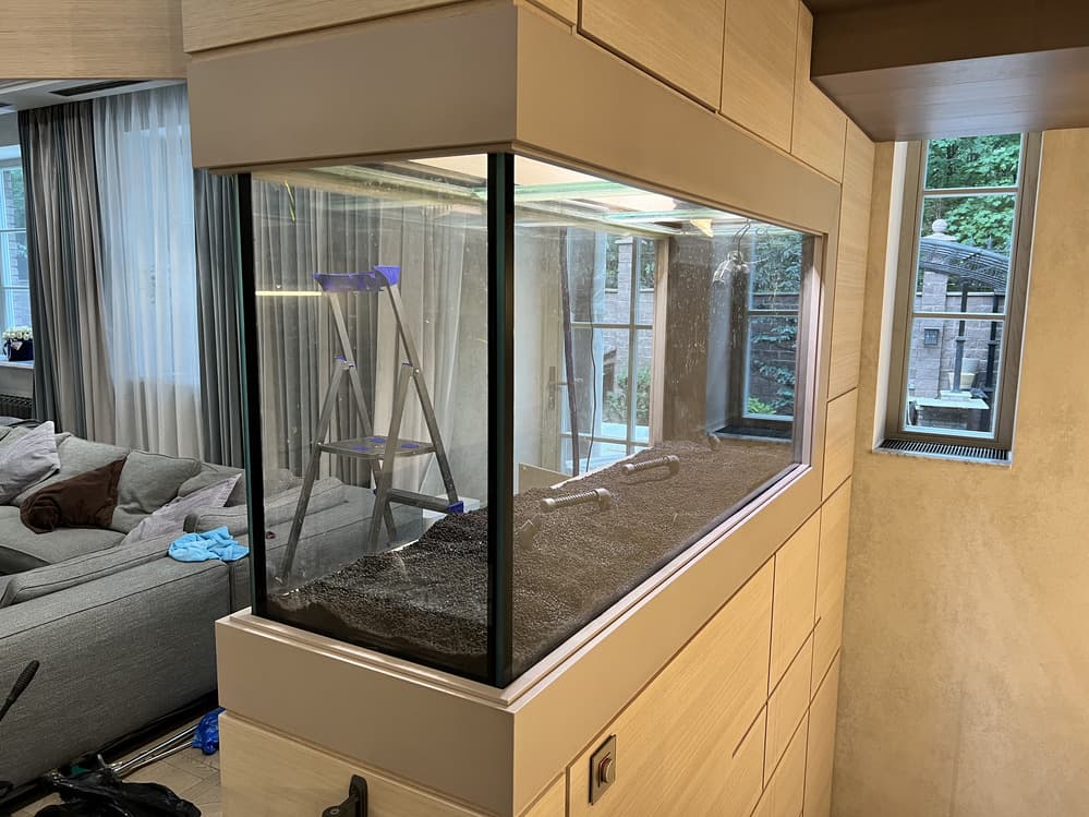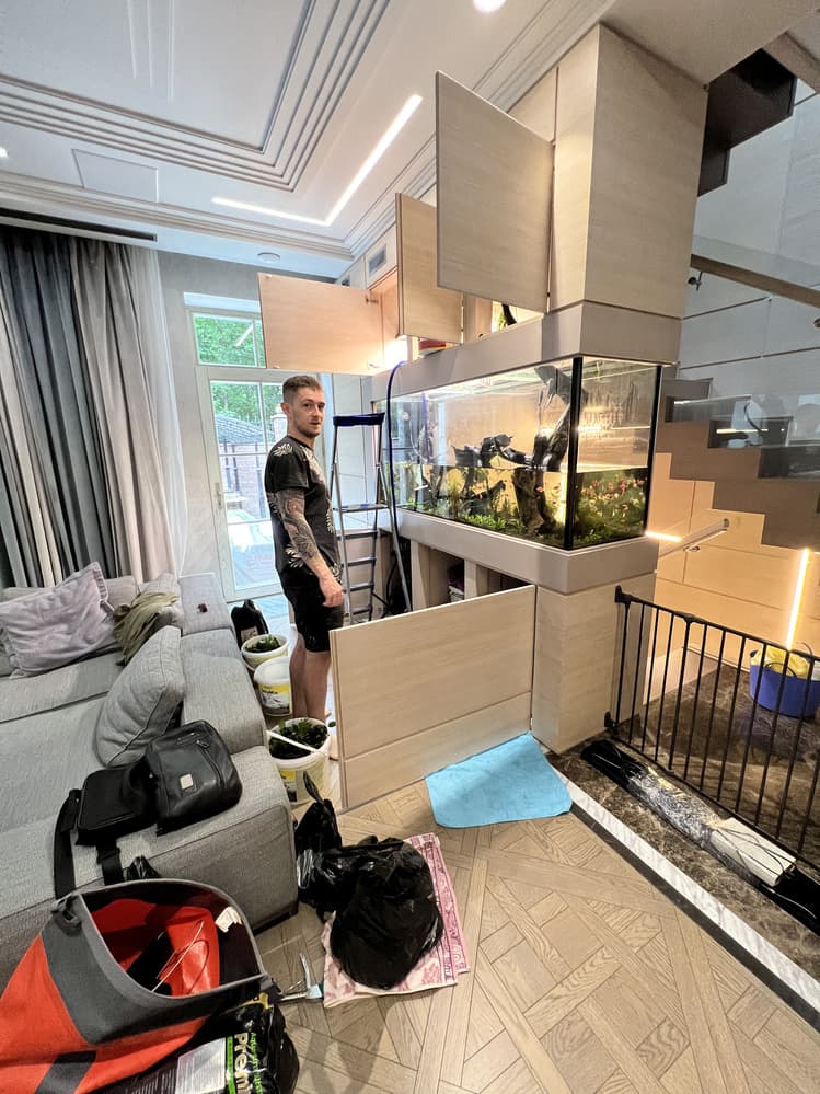 Живая перегородка, спроектированная на стадии строительства. Мы провели комплексное переоформление большого аквариума на 1000 литров в таунхаусе. Этот аквариум выполняет роль эффектной живой перегородки между гостиной и лестничным пространством, открываясь для обзора с трёх сторон.
