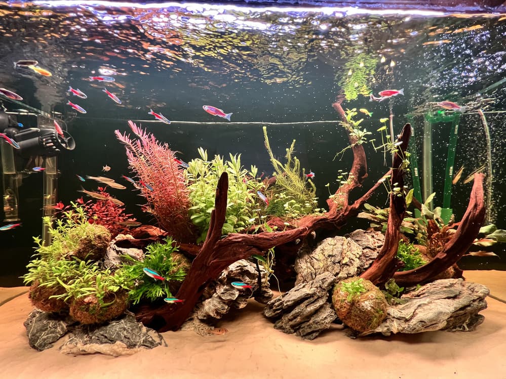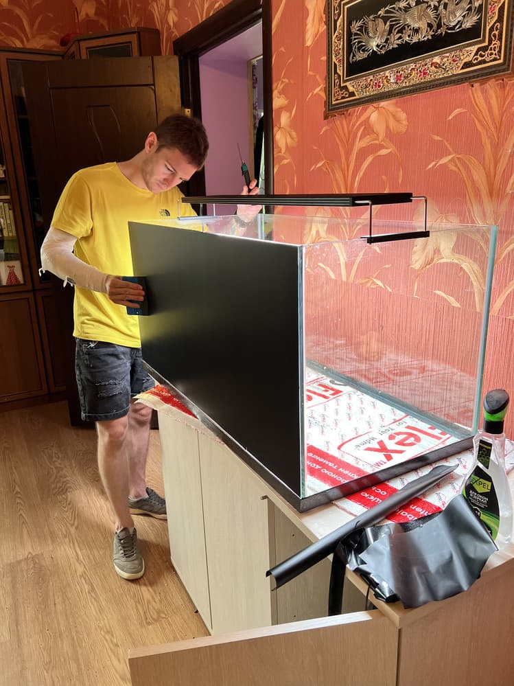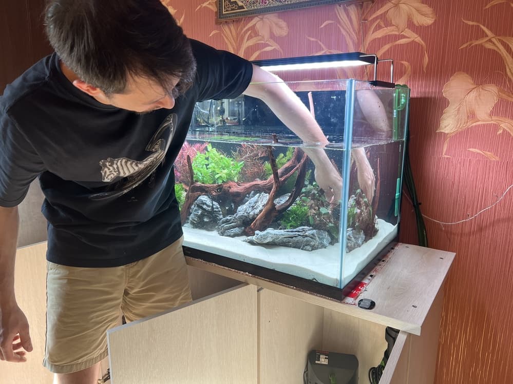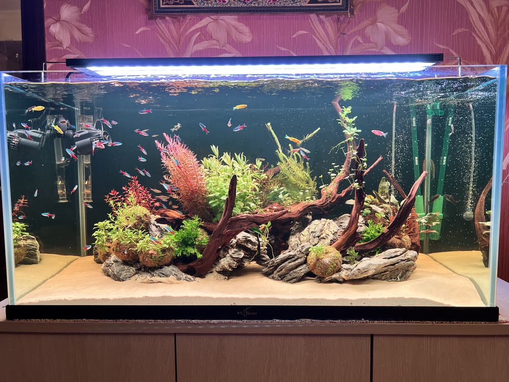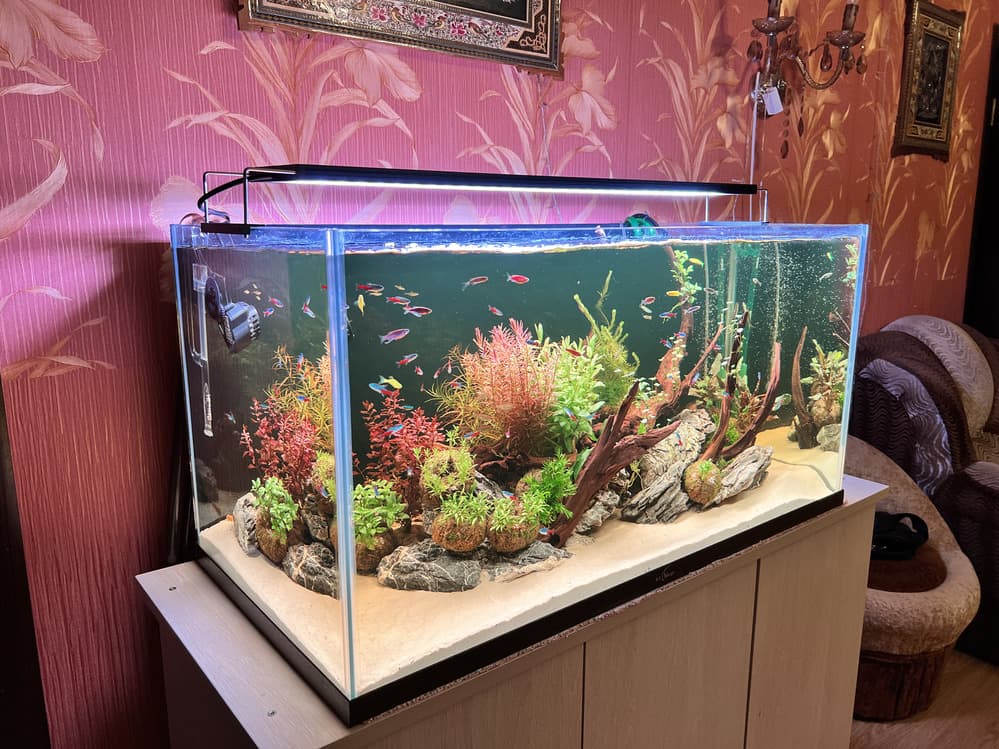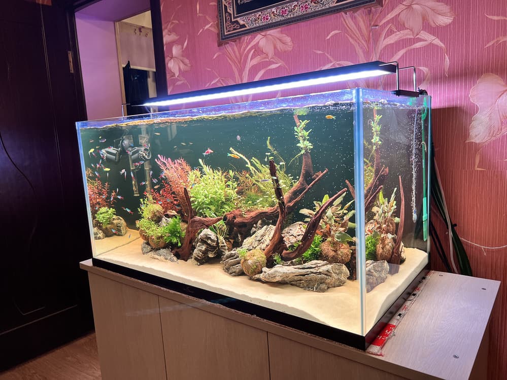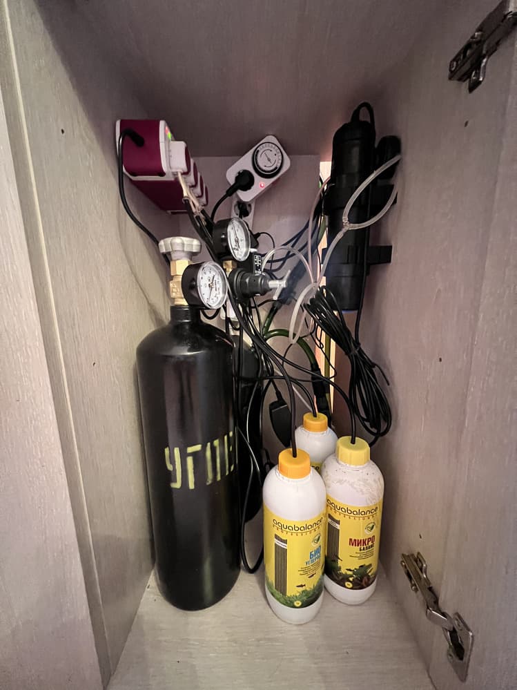 - Аквариум оснащен двумя внешними фильтрами, помпой течения, системой подачи СО2, а также профессиональным светильником.