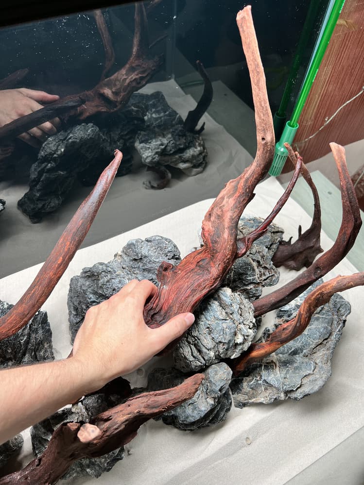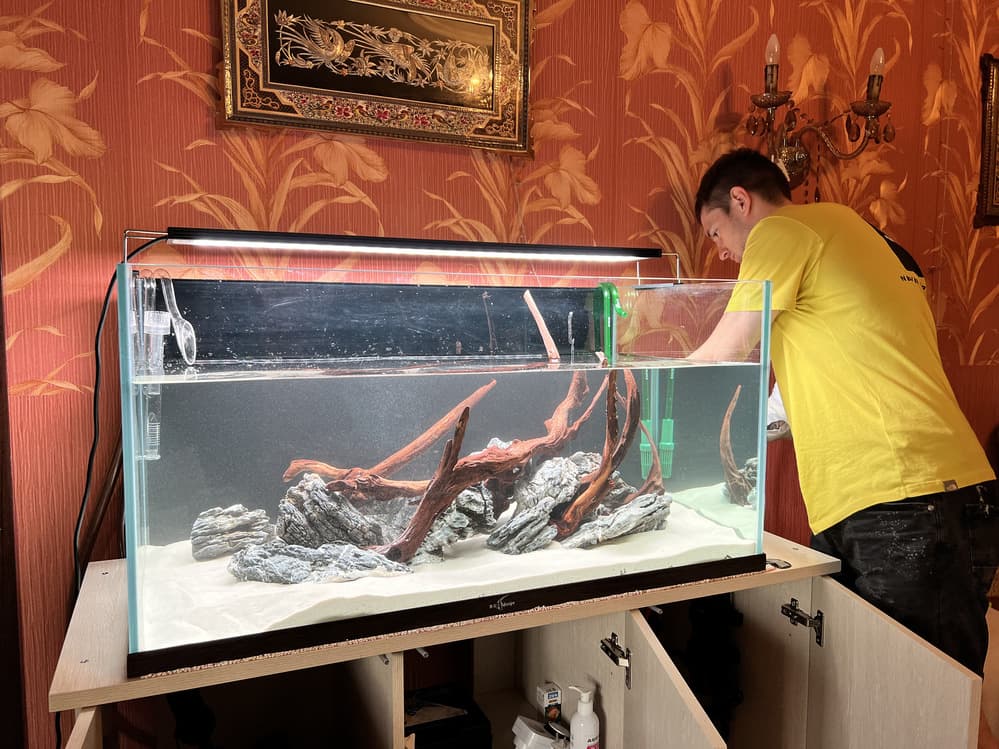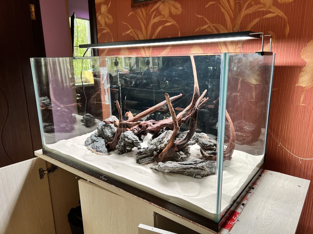 Открытый аквариум в стиле «хардскейп» с живыми растениями на питательных кочках. Нас пригласили в качестве оформителей: у клиента уже был установлен 400-литровый аквариум открытого типа в гостиной частного дома. В основе дизайна — песчаный грунт, «остров» из камня и коряг, на котором в специальных питательных кочках высажены растения.
