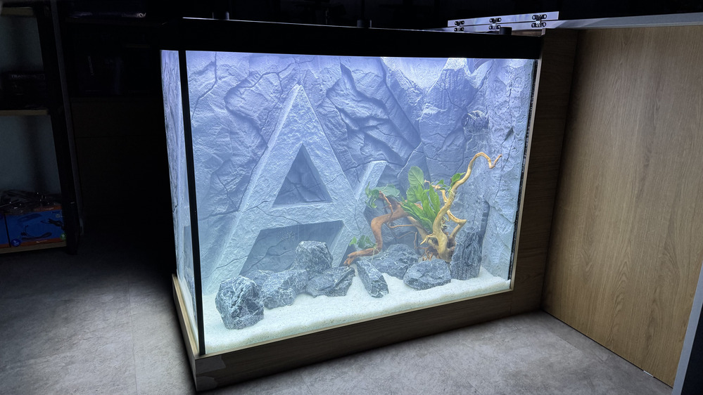 - «С»-образная облицовка аквариума МДФ панелиями, позволила скрыть все коммуникации аквариума. Само наполнение аквариума выполнено в минималистичном стиле, который только добавляет атмосферы дизайну помещения. Дискусы — яркиее, живые пятна на фоне эффектной 3D-декорации «скала».