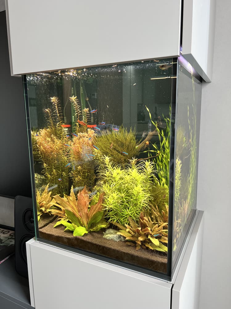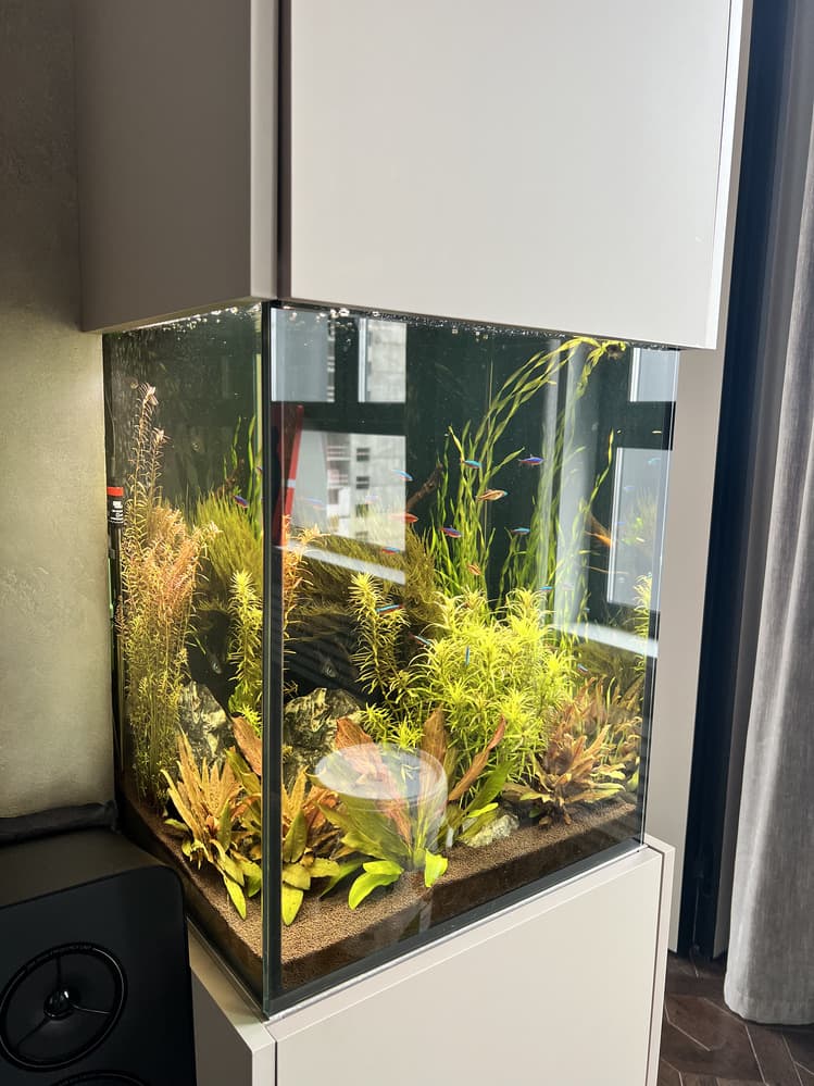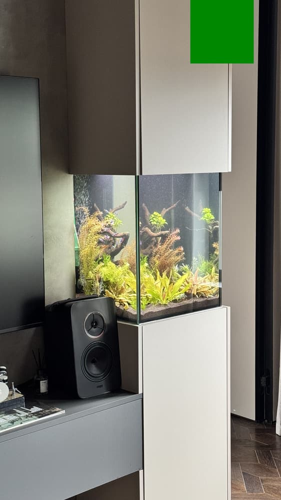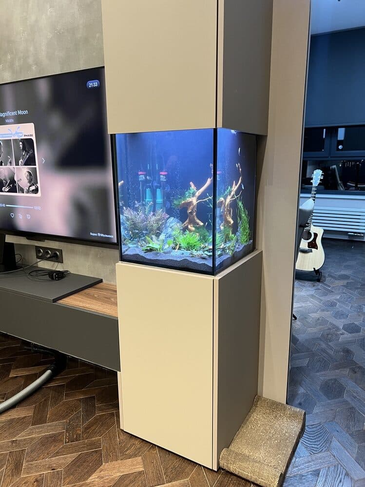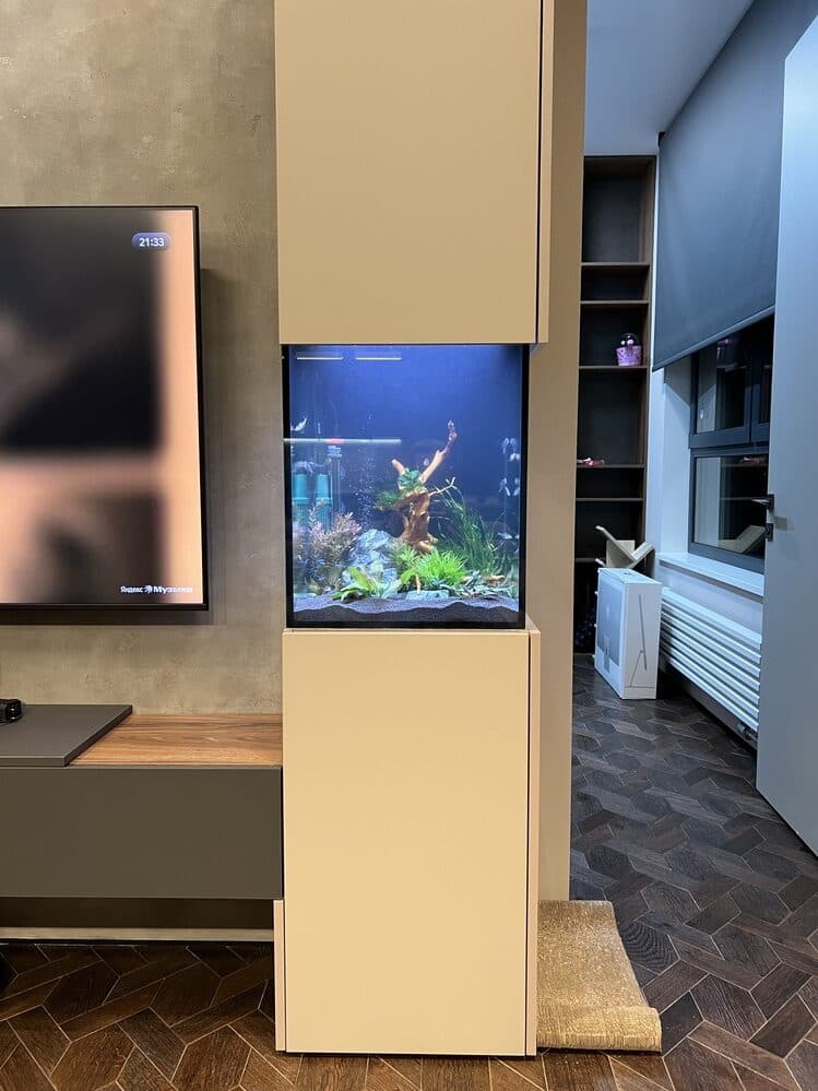 - Аквариум засажен пышными растениями разных видов, которые создают объём, насыщают воду кислородом и создают укрытия для рыб. Мебель изготавливали под цвет и дизайн существующей, использовали крашенные панели МДФ.