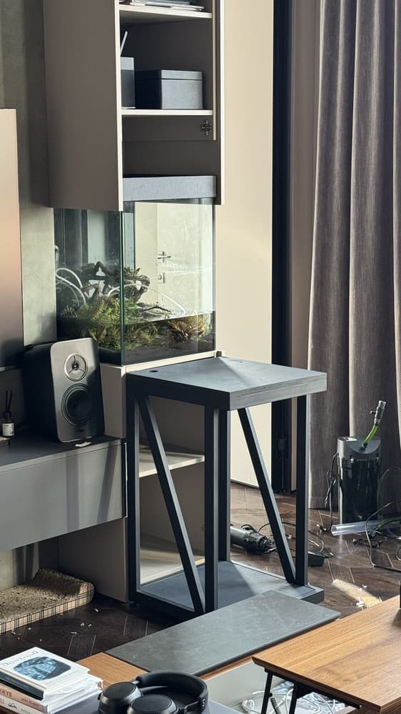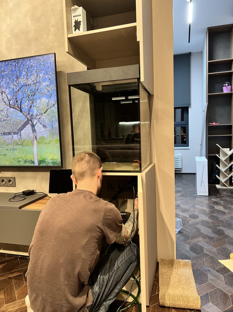 - Аквариум как идея был заранее учтен в проекте. Чтобы он аккуратно вписался в существующий дизайн и были учтены особенности примыкания аквариума к мебели, мы подготовили чертежи для согласования с дизайнером.