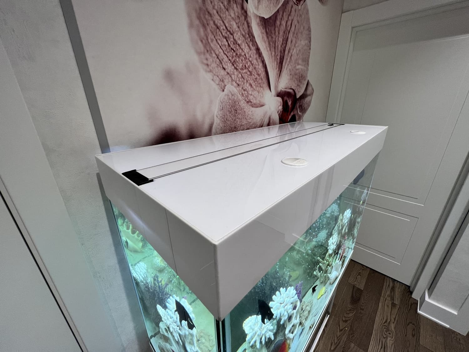 Этот аквариум по индивидуальным размерам стал сердцем прихожей.