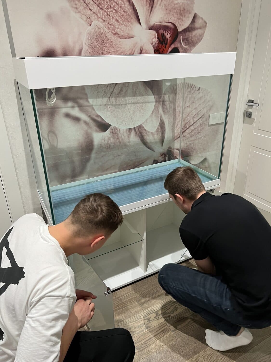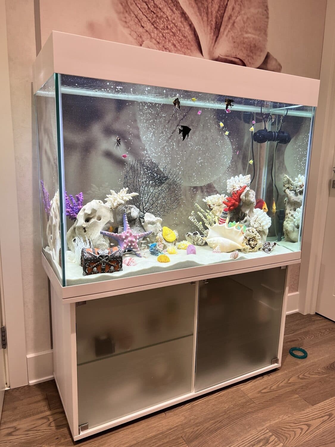 - Тумба из МДФ со стеклянными дверцами обеспечивает стильный вид. Оборудование подключено через дно аквариума с использованием проходных муфт. Это не только сохранило аккуратный внешний вид, но и сделало аквариумный комплекс максимально безопасным для детей, исключив лишние провода и доступ к технике.